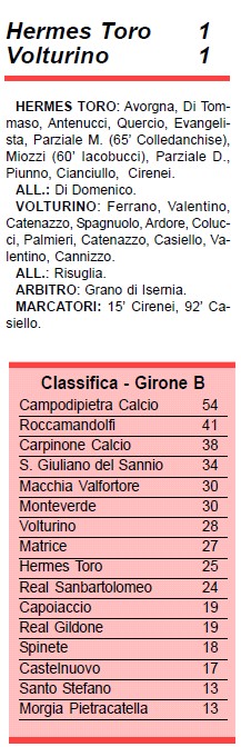 ![]() Rallenta la rincorsa l'Hermes Toro che, dopo tre vittorie consecutive, coglie un pari casalingo contro un buon Volturino. I ragazzi di mr. Di Domenico si portano a 25 punti in classifico, tornando al nono posto, scavalcati di nuovo dal Matrice.