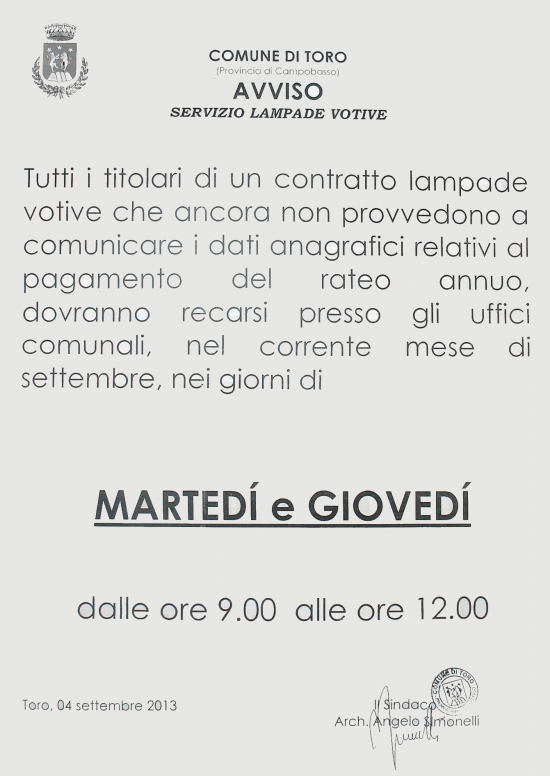 | "Avviso del Comune di Toro: Lampade votive" | Login/Crea Account | 0 commenti |