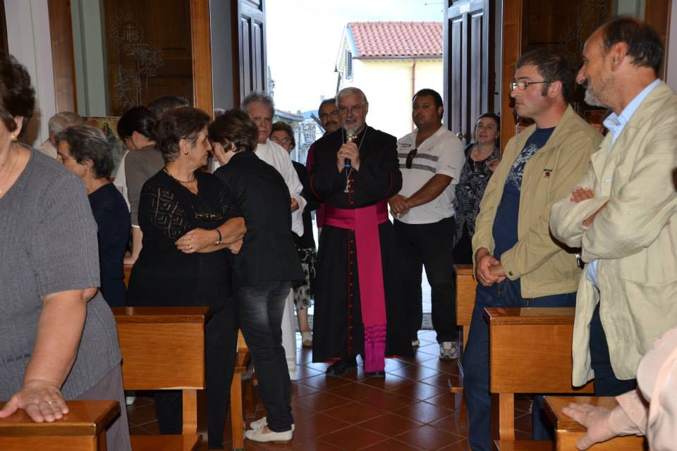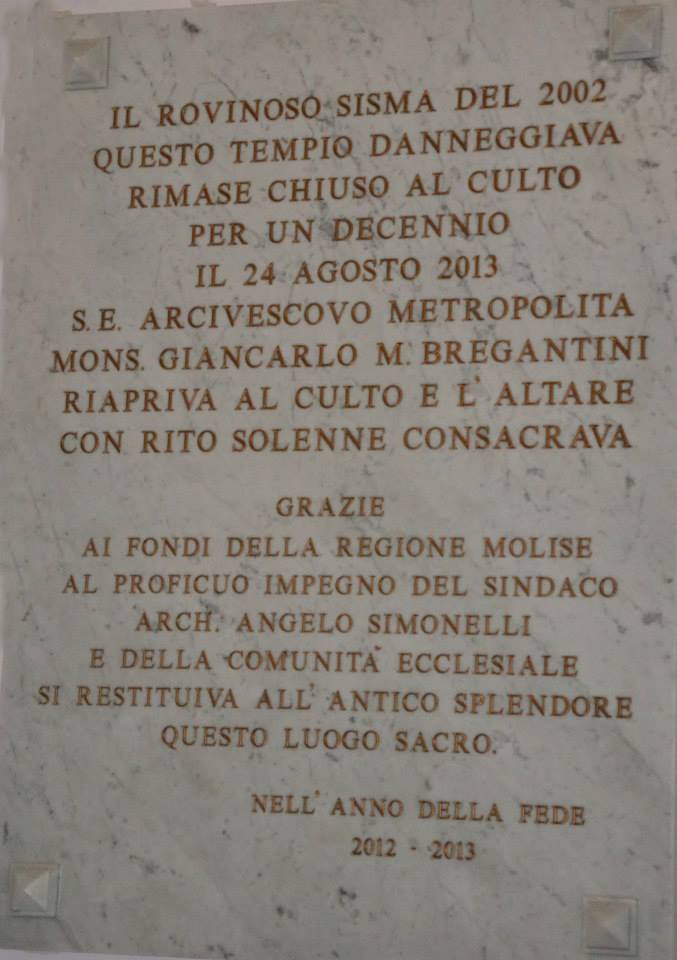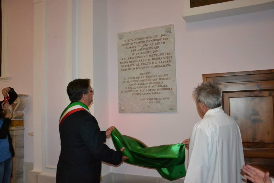 In apertura di cerimonia padre Gaetano e il sindaco Angelo Simonelli hanno scoperto la lapide, la quarta della serie come ha precisato mons Bregantini. L'iscrizione ricorda la riapertura della chiesa 'avvenuta il 24 agosto 2013, a seguito dell'inagibilità causata dal sisma del 2002 e durata undici anni. Secondo Bregantini, riciostruire è il carisma dei cristiani, cadere e rialzarsi, sull'esempio di Cristo che è morto è risorto.