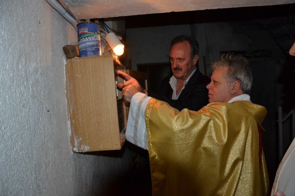 Alle spalle di padre Gaetano, lo scatto ha fissato simbolicamente il parroco uscente padre Cesare Neri