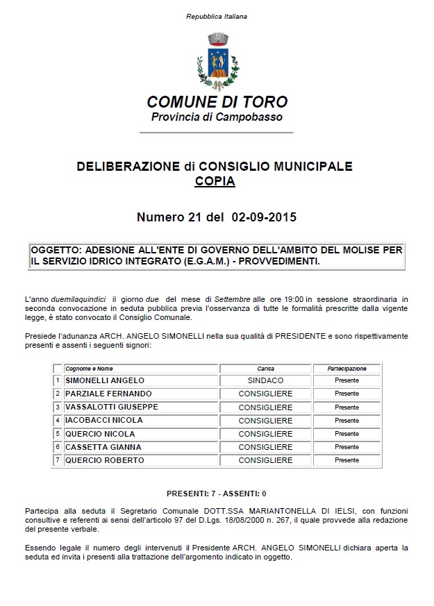 ![]() Chiamato a dare la propria ADESIONE ALL'ENTE DI GOVERNO DELL'AMBITO DEL MOLISE PER IL SERVIZIO IDRICO INTEGRATO (E.G.A.M.), il Consiglio Comunale di Toro nella seduta del 2 settembre 2015 ha deciso di rinviare la decisione a data da destinarsi in quanto la "questione relativa al costituendo EGAM è in evoluzione".