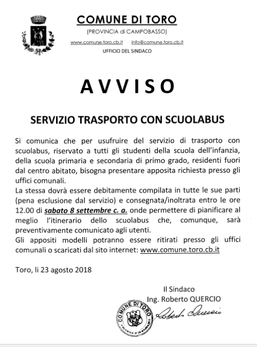 ![]() Il primo avviso riguarda la la fornitura, gratuita o semigratuita, dei libri di testo della scuola dell’obbligo e della secondaria superiore per l’anno scolastico 2018-2019, mentre il secondo si riferisce al servizio di trasporto con lo scuolabus per gli studenti residenti fuori dal centro abitato.