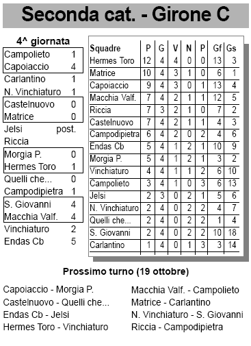 ![]() La partita con i pietracatellesi non è stata una semplice passeggiata, come qualcuno auspicava, ed è stata vinta grazie soprattutto alla determinazione ed al maggior tasso tecnico della formazione di mister Tucci che, approfittando del mezzo passo falso del Matrice, 0-0 a Carlantino, rimane da sola in testa nella classifica del girone C del campionato di 2^ categoria.