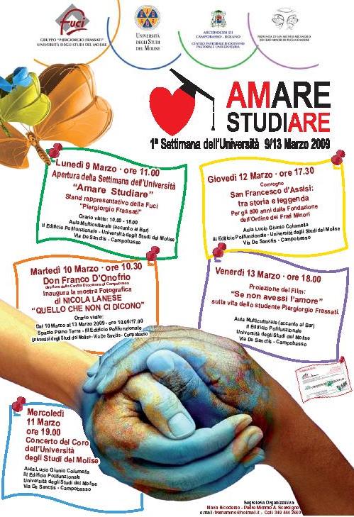 Amare e studiare. Si intitola così la Prima Settimana dell'Università del Molise. Cinque giorni dal 9 al 13 marzo di stand, mostre, concerti, convegni e film. Le iniziative sono organizzate da Fuci, Università del Molise, Arcidiocesi di Campobasso e Curia dei Frati Minori di Puglia e Molise per sensibilizzare i giovani universitari.