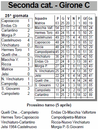 ![]() In un turno di campionato condizionato da un forte vento, l’Hermes vince con il minimo scarto contro Quelli che… e riacciuffa il terzo posto in classifica. Vincono anche le altre squadre in lotta per i playoff, eccetto il Riccia, che perde lo scontro diretto contro il Macchia Valfortore. In testa alla classifica il Matrice continua la sua fuga solitaria con ampio margine di vantaggio sulla seconda.