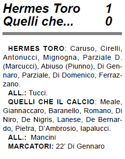 Un Hermes Toro decisamente sciupone batte di misura Quelli che… e rischia di subire il ritorno degli avversari che provano a cercare il pari con insistenza. La squadra di Tucci appare molto in forma e si fa vedere spesso dalle parti del portiere avversario, ma la palla non ne vuole sapere di entrare in rete; la partita si risolve al 22’ con Di Gennaro che sigla il match point. I toresi continuano a proporsi in attacco ma senza fortuna e devono anzi difendere con i denti il minimo vantaggio, con gli ospiti che sfiorano il pari in diverse occasioni.