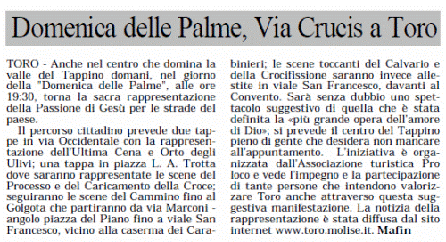 ![]() Nel giorno della “Domenica delle Palme” del 5 aprile 2009, alle ore 19:30, torna la sacra rappresentazione della Passione per le strade di Toro.