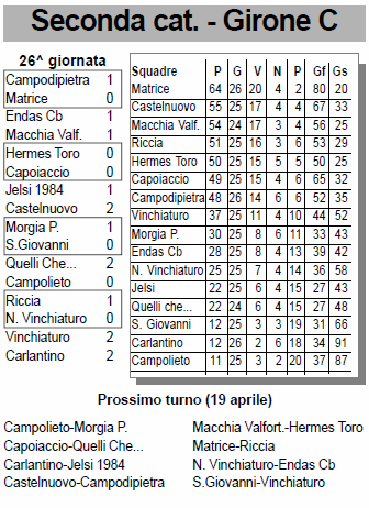 ![]() Nella 25^ giornata di campionato, dominata dall’importante vittoria del Campodipietra contro la capolista Matrice, vincono, tra le squadre di vertice, solo il Riccia e il Castelnuovo. Per l’Hermes Toro e il Macchia Valfortore invece, solo due striminziti pareggi.