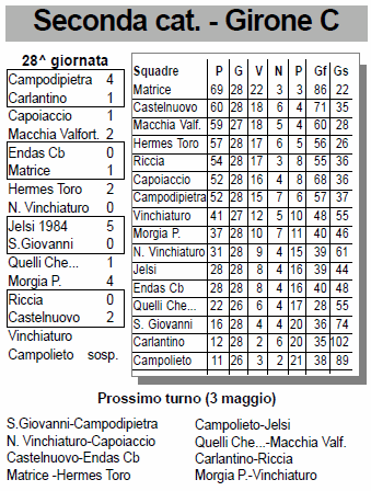![]() Nella terzultima giornata di campionato i rossoblu dell’Hermes battono il Nuovo Vinchiaturo e sono ad un passo dai playoff. Il Matrice, a cui vanno i nostri auguri, vince il campionato con due giornate di anticipo e viene promosso in 1^ Categoria.