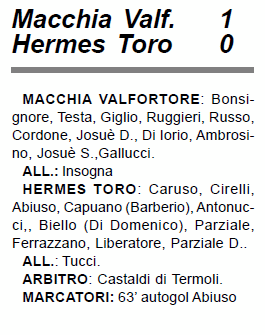 L’Hermes Toro perde di misura il confronto con il Macchia Valfortore per colpa di un autogol dell’esperto Abiuso, che nel tentativo di spazzare dopo una respinta di Monsignore sul tiro di Galucci, butta con una deviazione sfortunata il pallone nella propria porta. Gara diretta dal signor Castaldi di Termoli.