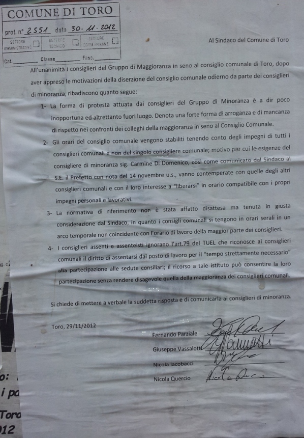 Come Redazione di ToroWeb abbiamo indirizzato una lettera aperta ai quattro consiglieri di maggioranza del Comune di Toro (Fernando Parziale, Giuseppe Vassolotti, Nicola Iacobacci e Nicola Quercio). A loro, come nostri rappresentanti istituzionali, abbiamo chiesto informazioni su una lettera che hanno indirizzato il 29 novembre al Sindaco di Toro, Angelo SImonelli. In particolare, perché si sono schierati contro la richiesta del consigliere Carmine Di Domenico a convocare i consigli comunali alle 20.00, e non alle 18.00, in modo che possa parteciparvi anche lui che lavora fuori sede.