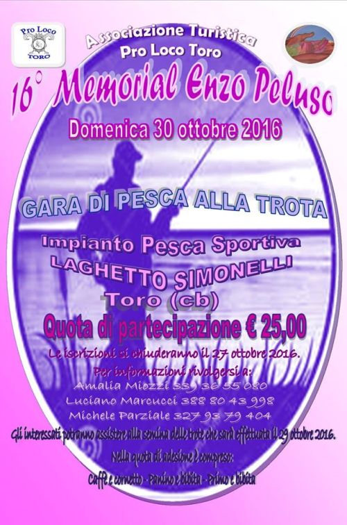 Una bella tradizione nel nome di un amico di Toro e dei toresi. Domenica 30 ottobre 2016 č in programma per gli appassionati di pesca la quindicesima edizione del Memorial Enzo Peluso. La gara di pesca alla trota, organizzata come sempre dalla Pro Loco di Toro, si terrā presso il Laghetto Simonelli in Contrada "Piana dei Capri" di Toro.
