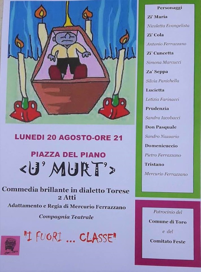 A sei anni dalla messa in scena della commedia in dialetto torese “U’ Murt’”, il gruppo teatrale I Fuori Classe tornerà ad allietare e divertire i toresi lunedì 20 agosto prossimo in Piazza del Piano a Toro.