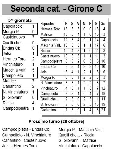 L'Hermes Toro supera il Vinchiaturo per 2-1, colleziona il quinto successo consecutivo e consolida il 1° posto in classifica con 15 punti, due in più del Matrice.