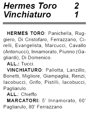 I toresi, al 5’ del primo tempo, passano in vantaggio con il bomber Innamorato che infila il portiere avversario con un bel pallonetto e per il resto della frazione controllano la partita con il piglio dei primi della classe. Nella ripresa il Vinchiaturo parte bene e perviene al pareggio al 60’ con Pagliarulo. L’Hermes non resta a guardare e si catapulta in avanti alla ricerca del gol vittoria che puntualmente arriva a 10 minuti dalla fine con una prodezza di Pietro Ferrazzano, tra i migliori in campo.