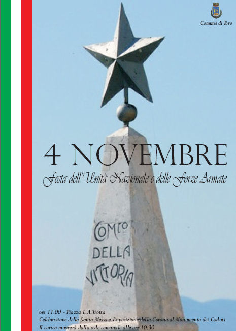 Quest’anno ricorre il 90° anniversario della data di emissione del Bollettino della Vittoria, con il quale venne annunciata, il 4 novembre 1918, la resa dell’Impero Austro-ungarico all’Italia che poneva fine alla prima guerra mondiale. (Nota Bene. Il Bollettino o Comunicato della Vittoria (COMto DELLA VITTORIA) è scolpito sulla stele del monumento torese, inaugurato il 25 agosto 1920, uno dei primi del Molise).