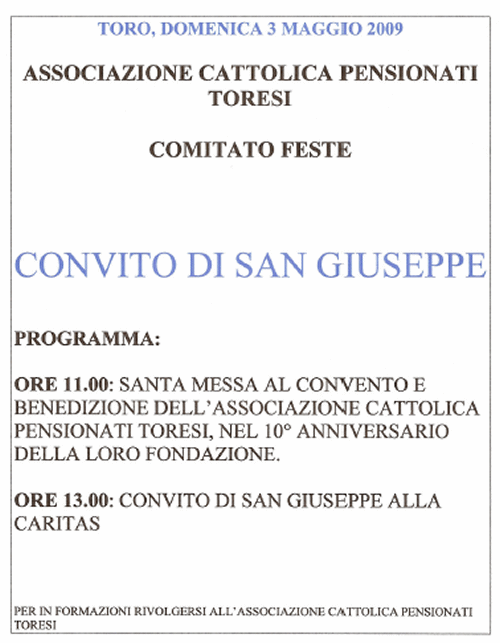 Il tradizionale “Convito di San Giuseppe” ritrova nuovo vigore tra i pensionati di Toro che, per domenica 3 maggio 2009, invitano la popolazione torese a riunirsi intorno all’agape fraterna presso il centro Caritas, nella ricorrenza del decennale della fondazione dell’Associazione Cattolica Pensionati Toresi.